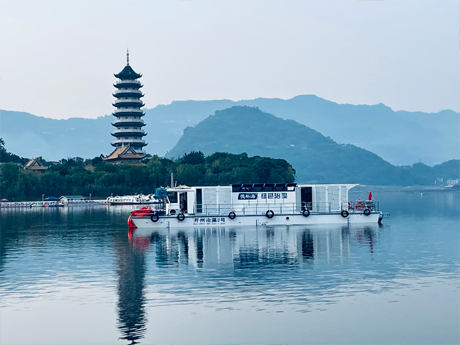 公司研發(fā)的加壓控藻船,以玻璃鋼船體為平臺(tái),配置藍(lán)藻打撈、壓力控藻和曝氣裝置...